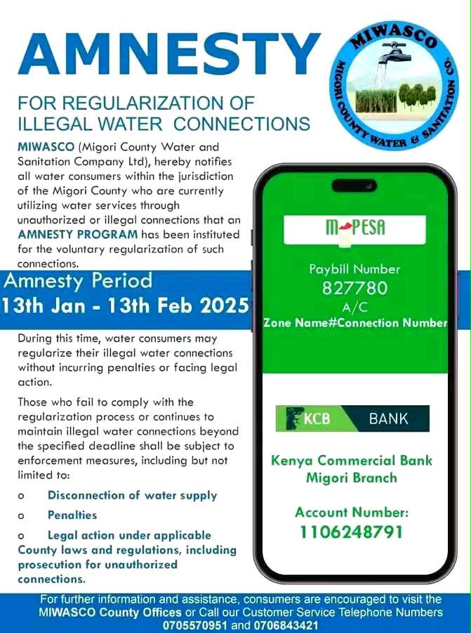 MIWASCO on Sh50m annual revenue target by curbing illegal connections, more income streams- NYANDIGA