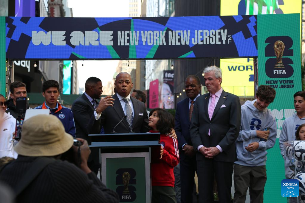 New York City Mayor Eric Adams (C) speaks at a launch ceremony of 2026 FIFA World Cup official brand and logo in New York City, the United States, on May 18, 2023. The official brand and logo for 2026 FIFA World Cup were launched in Times Square of New York City on Thursday morning. (Xinhua/Liu Yanan)